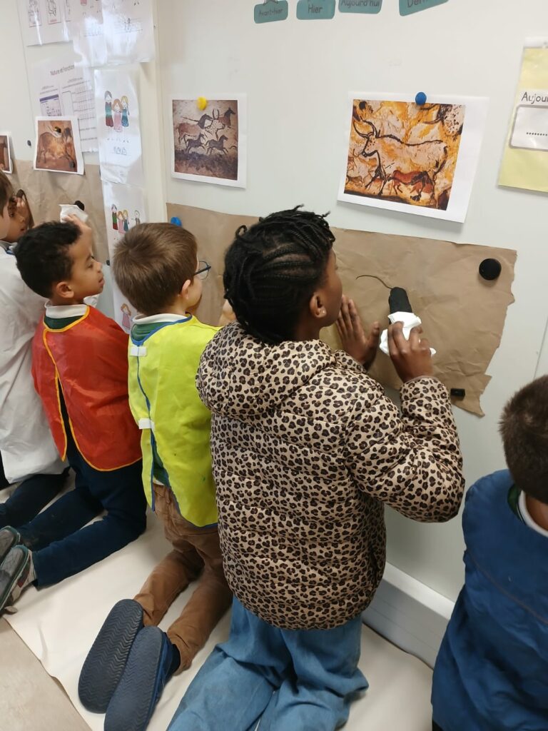 • L’empreinte positive et nĂ©gative : Les enfants ont apposĂ© leurs mains sur le papier, crĂ©ant ces silhouettes si caractĂ©ristiques que l’on retrouve sur les parois des grottes.