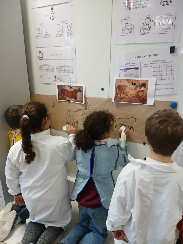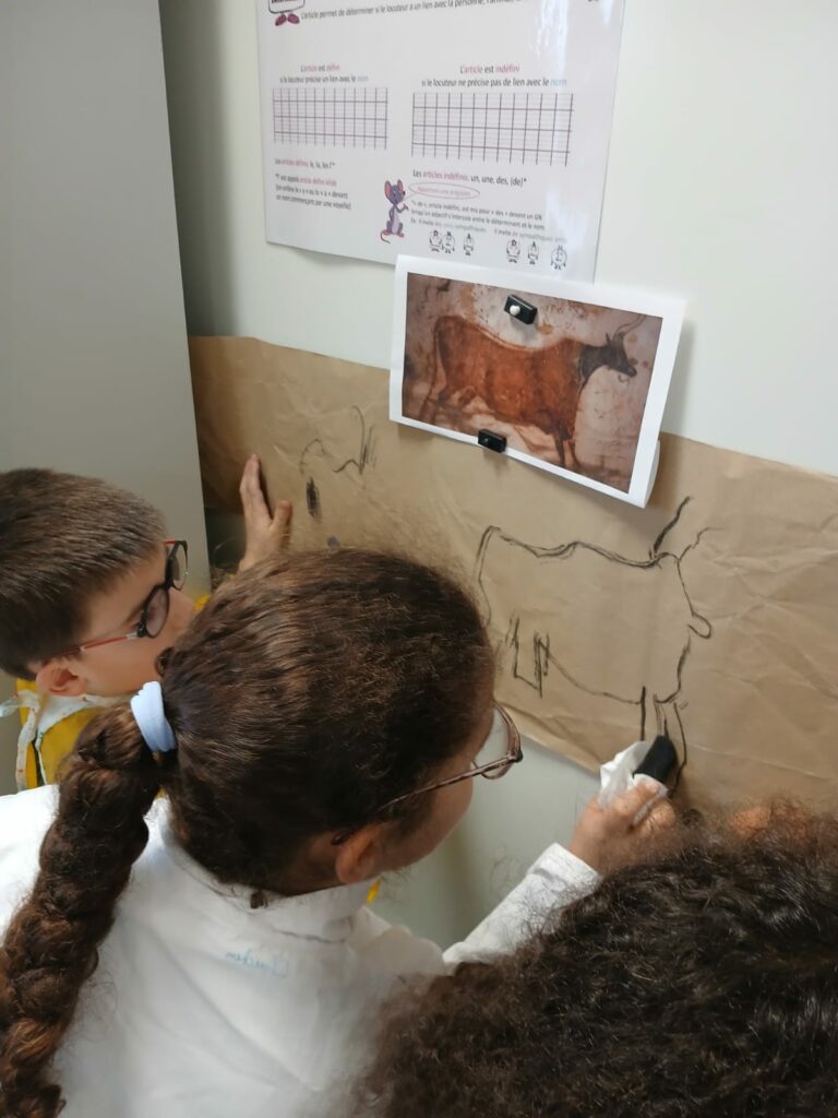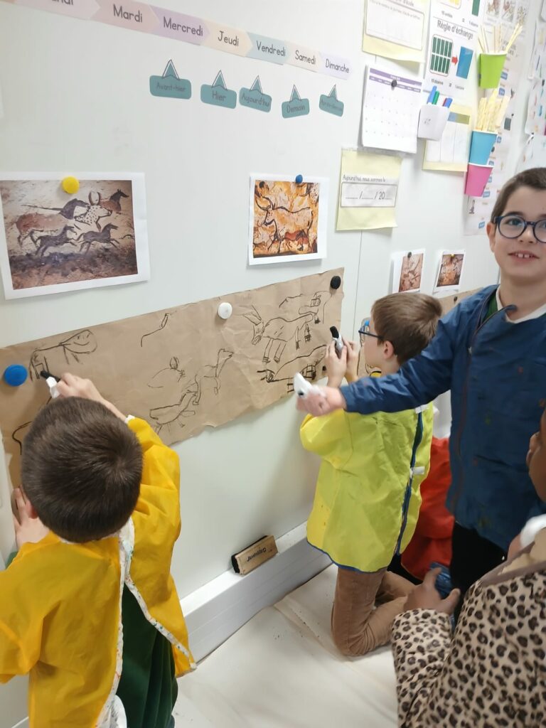 Chevaux, bisons et mammouths ont envahi les murs de la classe ! Cet exercice n’Ă©tait pas seulement artistique, il a permis aux Ă©lèves de travailler leur sens de l’observation et leur motricitĂ© fine. En essayant de reproduire le mouvement des animaux, ils ont rĂ©alisĂ© Ă  quel point les artistes de Lascaux Ă©taient des observateurs attentifs de la nature.